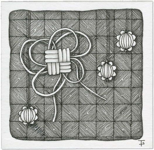 I added the Bulb Lanterns, and then I had to think about what to do with the background. I wanted a grid tangle and it needed to make the knot and lanterns stand out. After searching for a bit, I settled on Yincut. It takes a while to make all those lines but it is also fun and meditative to do. Also, I got up very early today, so I had the time for it.