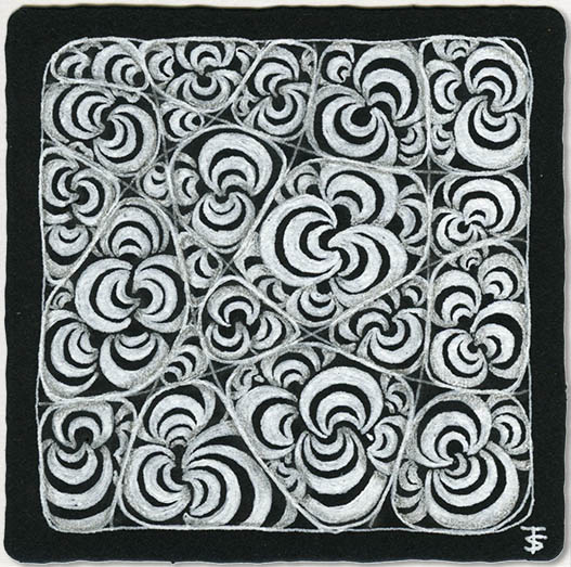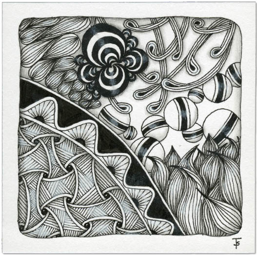 While I enjoyed drawing this tile, I think the overall compositione is chaos vs. organization. If it wasn’t for the lower left corner, the other tangles would kind of be floating in space!