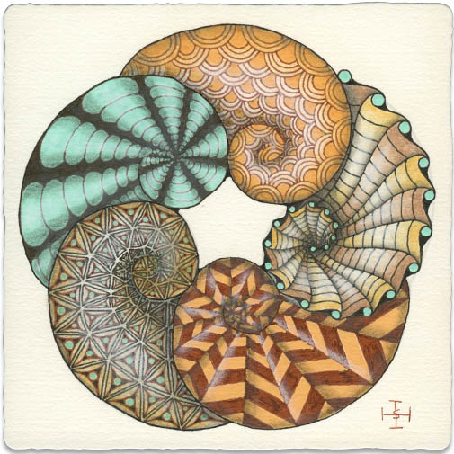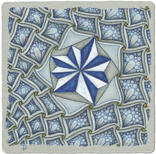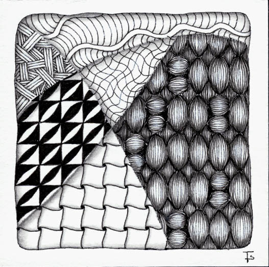 I like to have a tile that has a complex string with a lot of different spaces. I can sit down and fill an area with a random tangle when I have a few moments. But I don’t have to work on it until it’s done. I just return to it when I have a short bit of time.