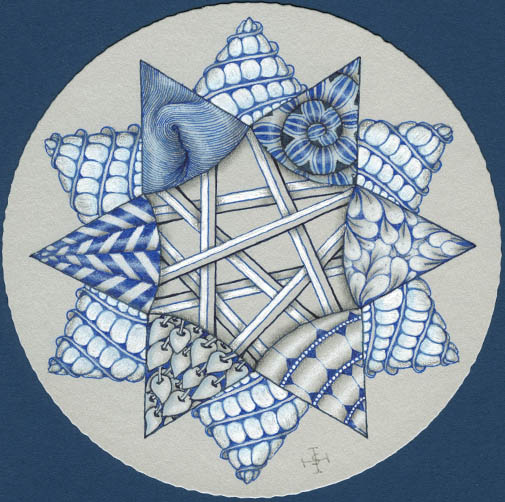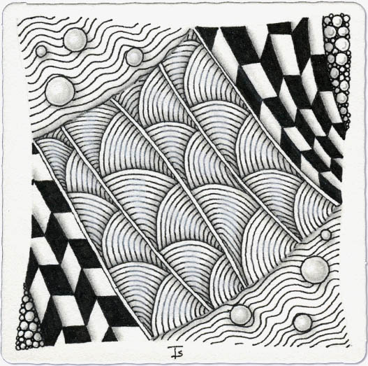 For this day, the new tangles are Jonqual, Nipa and Shattuck. The focus is on angular vs circular patterns. As an interesting shading exercise, the circles in Nipa could be shaded as an orb…or a hole!