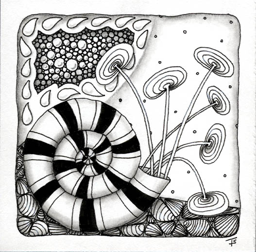 Some tangle patterns are a self-contained motif when completed. Many people call these blossom tangles. Here, I’ve used three different ones in a composition. I just wanted it to be simple, because I’m having a very busy day and don’t really have a lot of time for drawing.