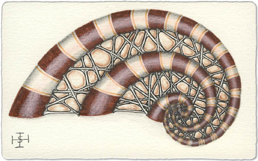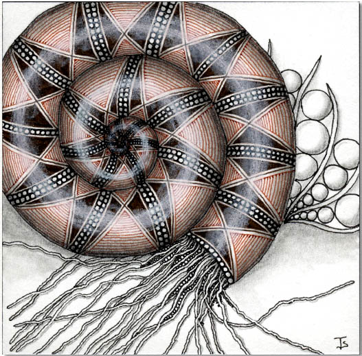 No border, a large, off-center spiral string, main object using colored pens, using reticula, surrounding support in black and white. I also used much heavier graphite on the spiral… at least heavier for me.