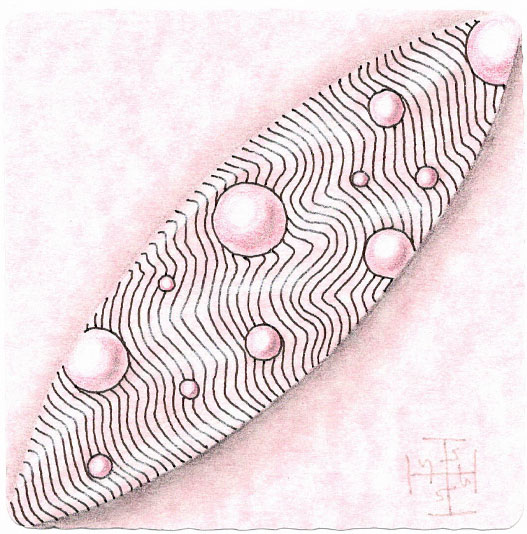 Zentangle drawn on pink printed parchment card stock using a black, Micron pen. Coloring done with colored pencil. Shading done with graphite and colored pencil. Highlights done with Zentangle white chalk pencil and white colored pencil.