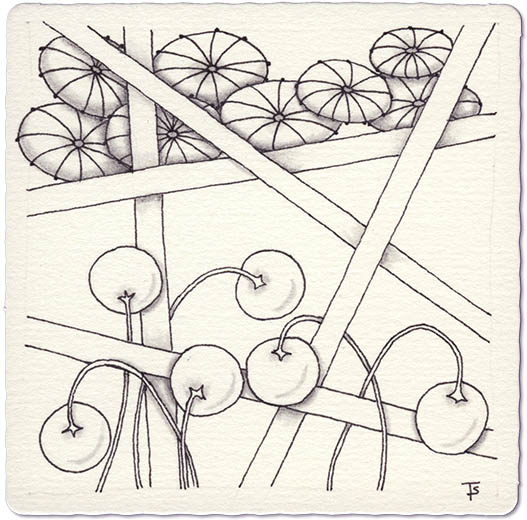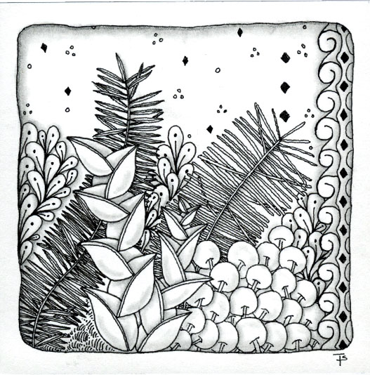 This is a very simple tile, with only three tangles. But by overlapping and allowing various parts to grow outside of boundaries, the tangles take on a life of their own.