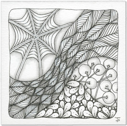 Above, you can see how the Poke Root stems and fruit weave in front of or behind the ribbons of the Hollibaugh tangle. At the top, the third tangle, Festune is drawn “behind” these ribbons. In Zentangle, the term “drawing behind” is used to describe this technique.