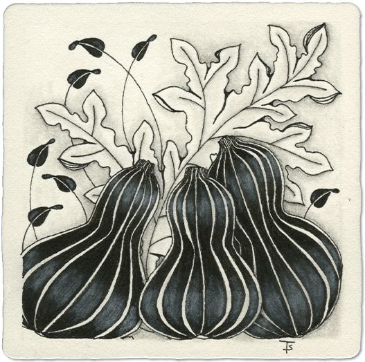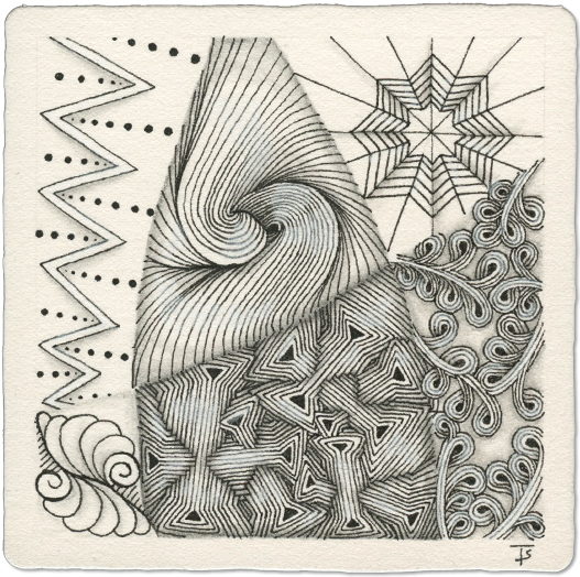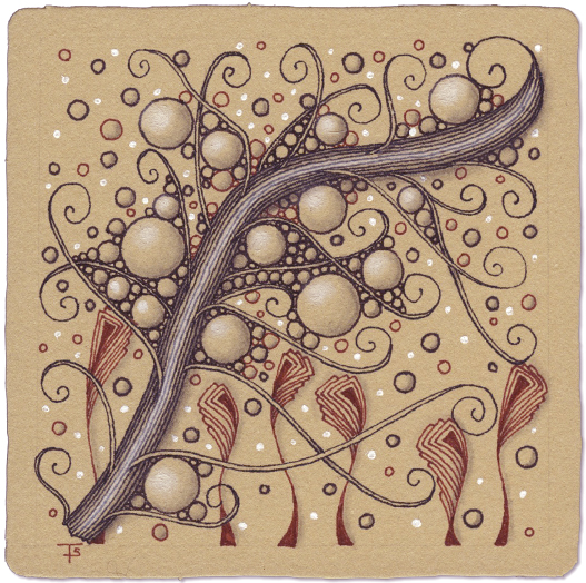 This is a curvy, botanical-ish tangle that can while and wend around your tile, depending on what size you choose to make it. It is even possible to make a radial version with multiple “arms”.