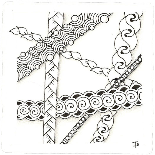Day four of going back to basics with my Zentangle practice. For this tile, I chose a string at random from the instruction booklet, and random tangles from the Legend card and the back of the booklet.