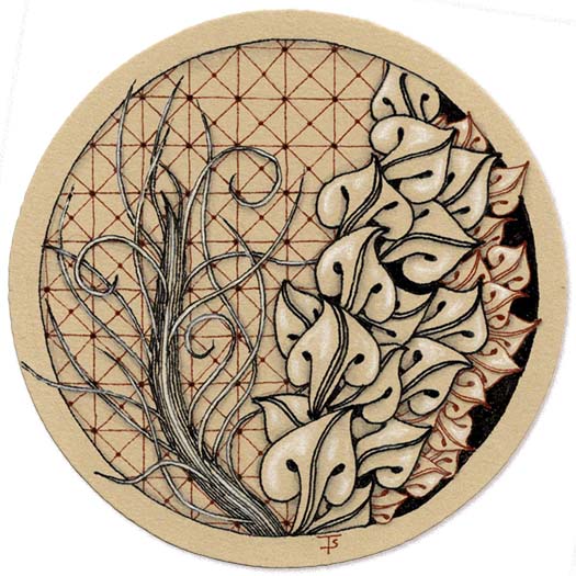 Zentangle drawn on Strathmore Vellum Bristol using brown and sepia Micron pens. Shading done with pen stippling.