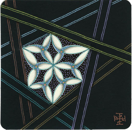 I found it interesting to divide the tile with the MI2 tangle. In the end result, I’m not sure I like it. I was certainly uncomfortable to work this way.