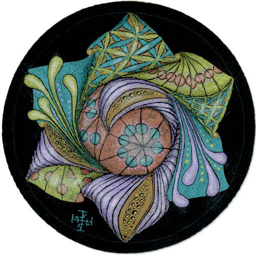Zentangle drawn on a black Apprentics tile. Drawing was done using several colors of Sakura’s Moonlight gel pens. Shading done with black colored pencil. Highlights created with a white chalk pencil.