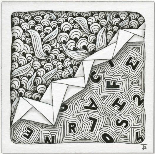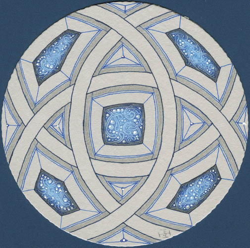 In the interim, here is a standard completed tile, using my standard method of randomly choosing tangles and filling in a string. I did incorporate a few new variations of traditional tangles that I’ve recently learned. It meant a lot of line work, but these tiles generally finish quickly.