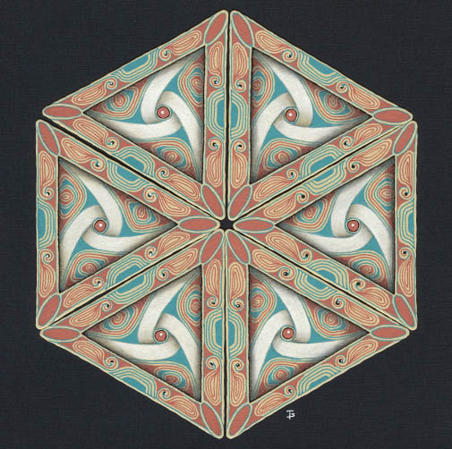 While all these tiles appear the same at first glance, there are two different center designs, three tiles with the “arms” of the center going clockwise and three with the “arms” of the center going counter clockwise. The direction of the tiles alternates going around the hexigon.