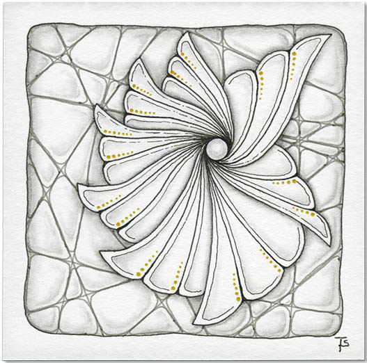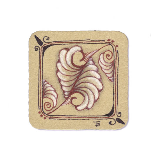 The first thing that attracted my attention was the border on the tag on page 124, so, after drawing a simple border around my tile, I added the Mooka design. Then I decided to repeat the Mookas and create a kind of square in the center of the tile, which also created the triangles in the corners. The corners were a perfect place for Diva Dance!