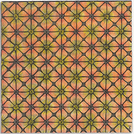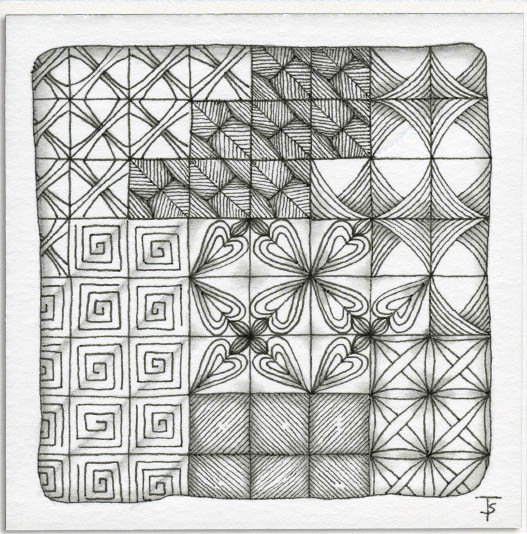 I did a grid tile previously, which you can see here . I think this is going to become a “go to” string when I am really busy or can’t think of what to do! They are fun to do, but don’t require a lot of figuring out! However, I will need to do a little better selecting tangles… since I duplicated two of them between the tile above and that previous one!