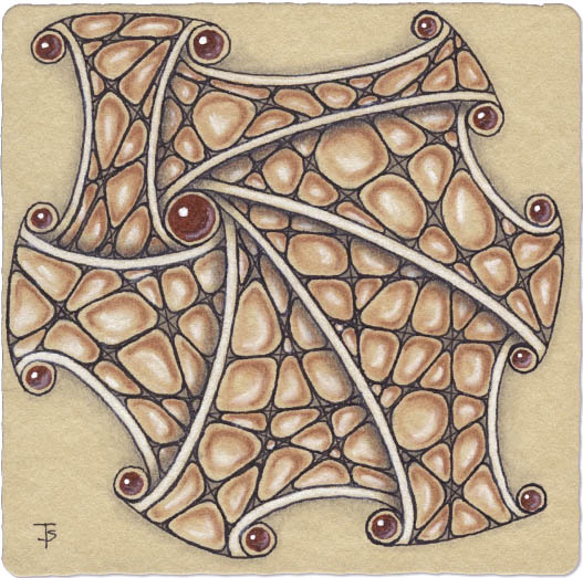 Zentangle drawn on a tan Zentangle tile using black and brown Micron pens. Shading done with pastel pencil and graphite pencil. Highlights created with white chalk pencil.
