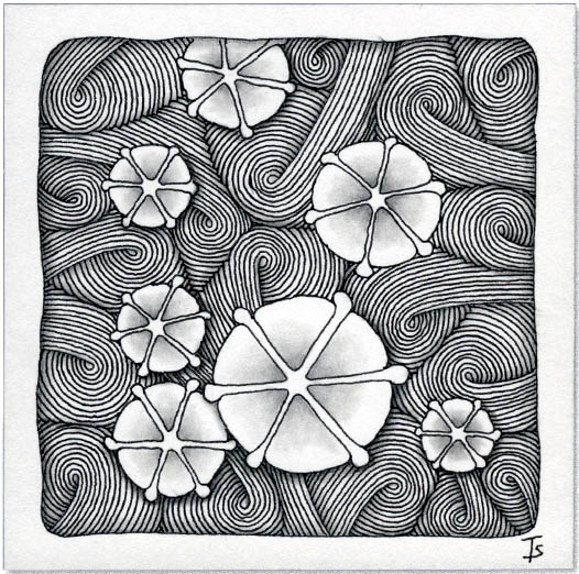 I learned this version of Tripoli from watching a video in which Martha (from Zentangle) described taking her children to the local aquarium and watching the jelly fish. While these don’t look exactly like them, it does invoke the feeling of moon jellies!