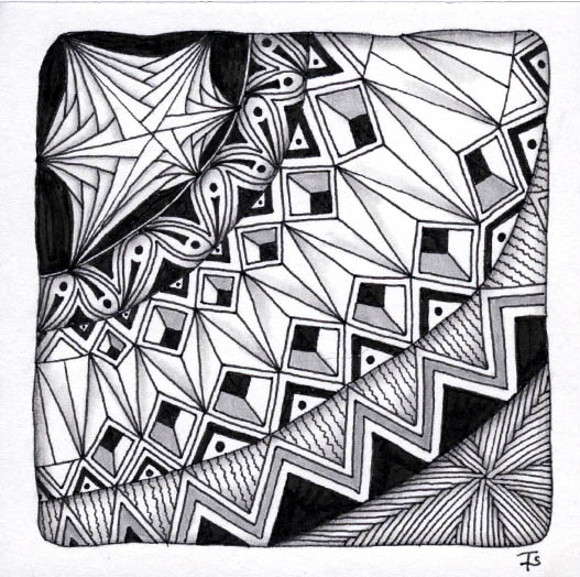 I don’t tangle in a journal, per se, so instead, I just did it very large on a tile and filled in the sections with Crazy ‘Nzepple and Dansk. Looking back, I found that I often use the first, but this is the first time I’ve used the latter with Huggins.