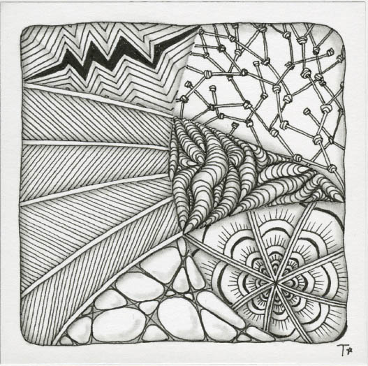 This tile has many tangles that I enjoy drawing. Repetitive line work is very relaxing. Squirmy is a favorite because it can fill any space. And Crazy “Nzepple is just fun.