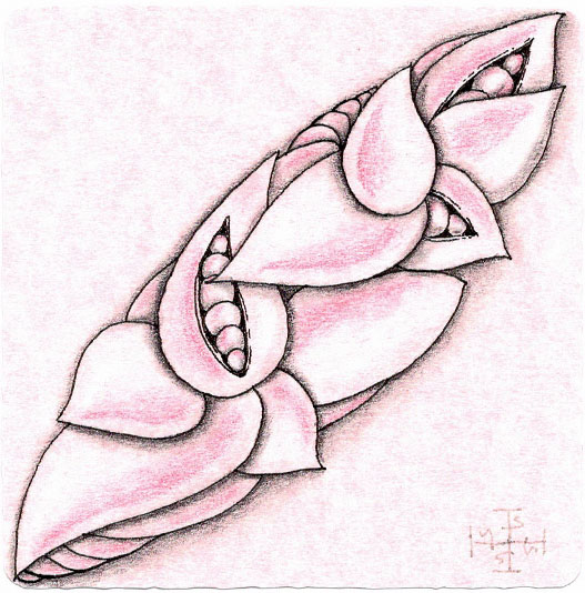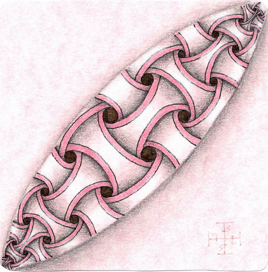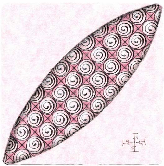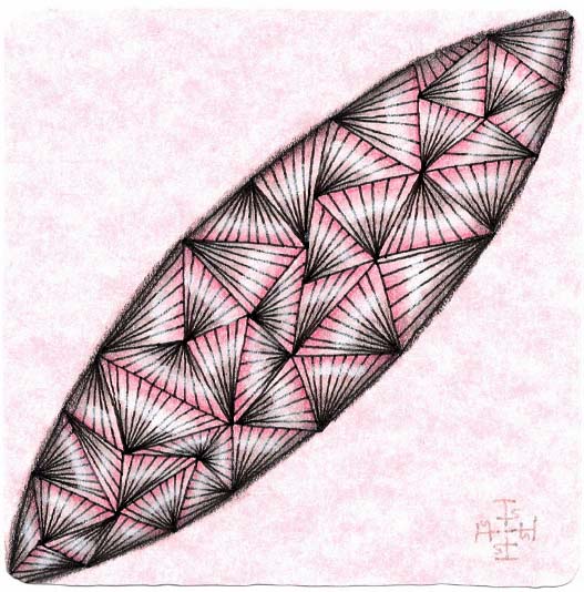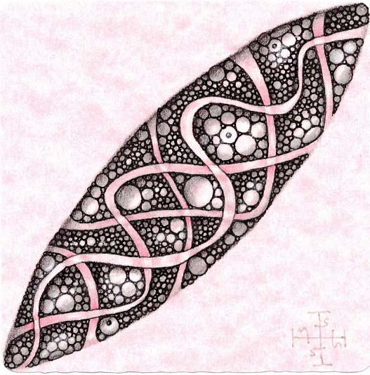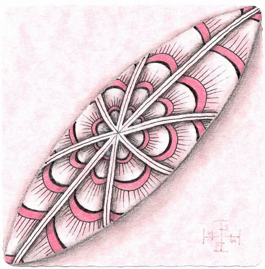 Zentangle drawn on pink printed parchment card stock using a black, Micron pen. Coloring done with colored pencil. Shading done with colored and graphite pencil. Highlights done with Zentangle white chalk pencil.