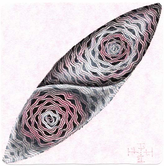 The string for this tile came from a bunch that I have collected and numbered over the years. I often just use a random number generator to choose one and then fill it with random tangles. I never ceases to surprise me what I end up with.