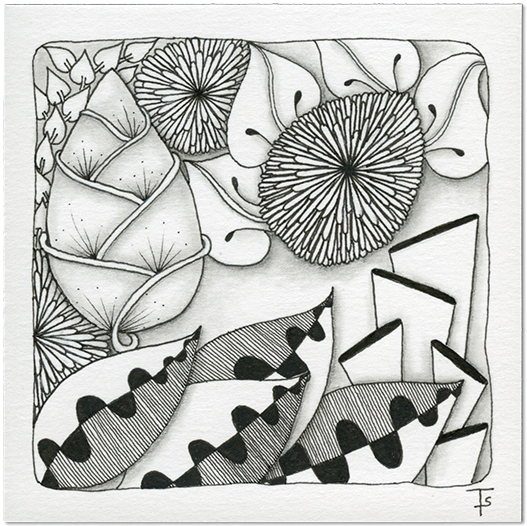 This started out with a leftover tangle, Carpet Daisy, from yesterday’s random tangles. I kept it for today because I wanted to use it with some other tangles for a “botanical” tile.