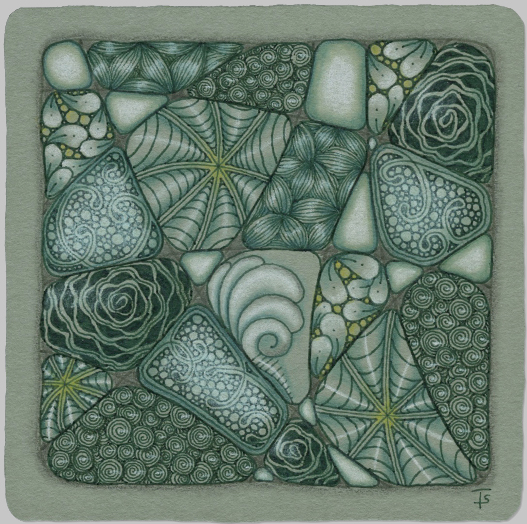 I don’t tangle in a journal, per se, so instead, I just did it very large on a tile and filled in the sections with Crazy ‘Nzepple and Dansk. Looking back, I found that I often use the first, but this is the first time I’ve used the latter with Huggins.
