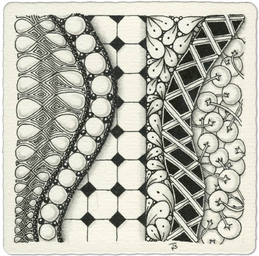 This tile includes the first tangle I designed: Bamboo. While it‘s not an “official” tangle, it‘s still one of my favorites. It works as a filler or a border. You could even use it as a tangelation with Hollibaugh!
