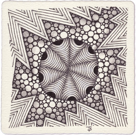 You will recall that I said yesterday I was working on a challenge with another tangler? Well, here is her tangle based on the same lesson! I love how she made the Tipple into bubbles, including a few popping at the upper and lower right!