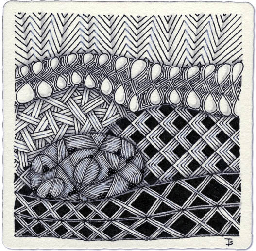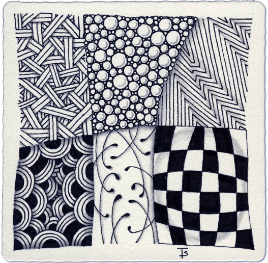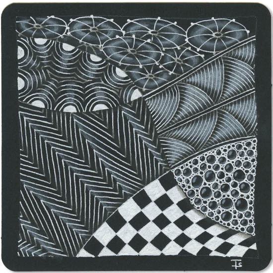 This tile has several tangles that I haven‘t drawn in some time. And the style is more like what I did years ago than what has evolved since then. Every so often, I think it‘s a good idea to reflect on the past.